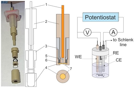 A special home-made design was used for the working electrode (Figure 1), where the electrode surface represented a circular end face of platinum rod 5, which was fixed inside insulating body 2 together with current supplier 1. The electrode surface was separated by membrane 7 (held in tight contact with the electrode surface by cover 4) from the external solution.