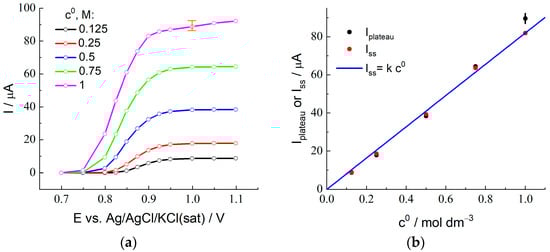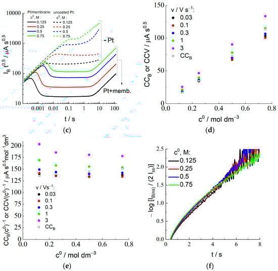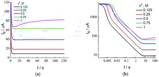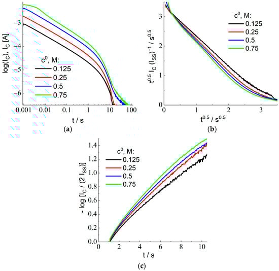 Variation of the nonstationary current in time, IC vs. t, after the second large-amplitude potential step (from 1.0 to 0.4 V) is shown in Figure 5a in the bilogarithmic coordinates (decimal logarithm is used again). Plots for the HBr concentrations in the external solution, c0, within the range between 0.125 and 0.75 M have approximately the same shape, being displaced along the Y-axis. This feature is in agreement with the theoretical prediction on the proportionality of the current to the concentration, c0, Equation (28) for IC and Equation (11) for Iss. This behavior breaks down within the time range over 10 s since the intensity of the current becomes too weak for its reliable measurement.