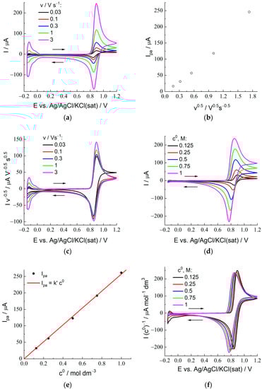 The CCB parameter for each solution composition has been determined as the value of IB t1/2 within the time range of its constancy, which extends in Figure 4c from around 0.01 s to several seconds. Values of the CCV parameter, i.e., an analog of the CCB parameter, have also been found from CV data (peak current for the forward scan, Ipa) in Figure 3 and Figure S1 with the use of Equation (22) for each HBr concentration and each scan rate.