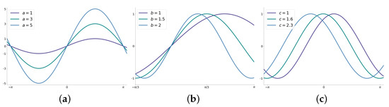 Effects of the terms a, b and c in Equation (1): (a) variations for the parameter a, (b) variations for the parameter b and (c) variations for the parameter c.