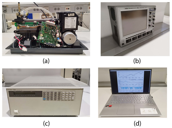 Experimental data acquisition configuration used for the Sinusoidal model training and validation: (a) Nexa power module from Ballard Power Systems, (b) LeCroy WaveSurfer 64Xs-A oscilloscope that saves trace data to an internal memory location, (c) Agilent 6050A Electronic load, (d) Laptop computer + LabVIEW program used to control the electronic load using the National Instruments GPIB-USB-HS+ software program to monitor the Nexa Fuel Cell.