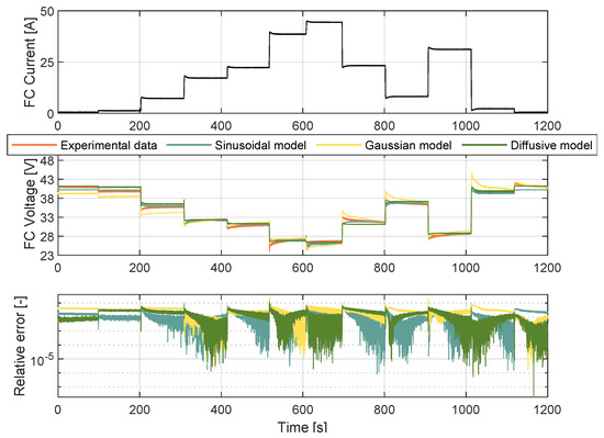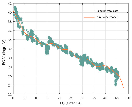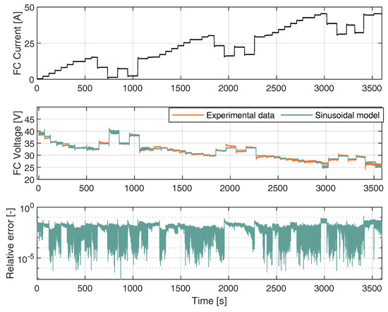 where I is the current data input from the FC. In this context, Equation (7) provides the estimation of the voltage given the current I. It can be observed that, as the current drawn from the FC increased, the FC voltage decreased. Additionally, the simulated FC voltage closely followed the experimental FC voltage. A high deviation between the experimental voltage data and the values estimated by the model occurred at 3410.74 s, corresponding to a current input of 44.45 A. At this point, the voltage difference was 3 V, corresponding to a relative error of 13.37%. The modeling results were quantified using the root mean square error (RMSE). The obtained results are considered satisfactory, given the fact that, for the proposed model, the RMSE was 0.44 V.