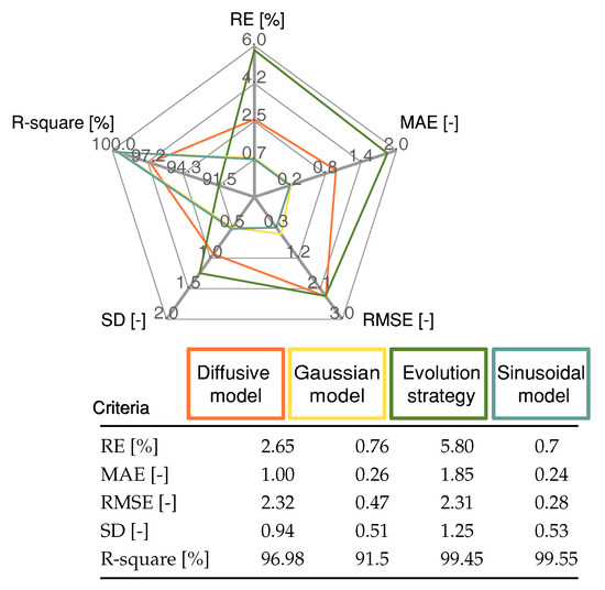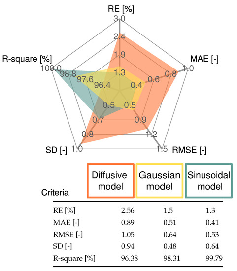 The statistical indicator results presented in Figure 7 demonstrate that the proposed Sinusoidal model produced a low error rate and a high R-square value compared with the Diffusive global model and the Gaussian model. The Gaussian model produced a lower value for the SD criteria only.