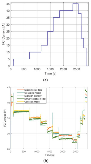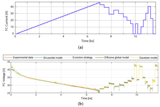 Experimental Nexa FC data used for training: (a) current load profile, (b) output voltage simulated with parameters estimated by means of the ES, the diffusive global model, the Gaussian model, and the Sinusoidal model.