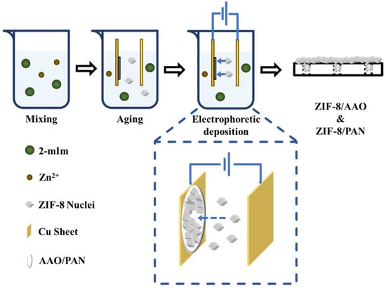 The fabrication of ZIF-8 membranes on a substrate was conducted as follows (Figure 1). First, a ZnNO3 solution with a concentration of 18.5 mmol/L and a 2-methyimidazole with a concentration of 1.38 mol/L using DI water as the solvent were prepared. Second, 30 mL of ZnNO3 aqueous solution was mixed with a certain amount of 2-methyimidazole solution by stirring for 30 s. Third, the cathode copper foil attached with a substrate and the anode copper foil were immersed into the mixture solution. The electrodes were connected with an electrochemical station, and the distance between the electrodes was set as 1 cm. Fourth, the EPD process was started after aging the precursor solution for 3 min. After a certain time, the EPD process was stopped by switching off the electric current. The membranes were taken off from the copper foil and placed in a petri dish for drying at room temperature. The resulting membranes using PAN and AAO as supports were denoted as ZIF-8/PAN and ZIF-8/AAO, respectively.