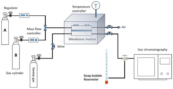 The device for gas separation test mainly comprises a gas cylinder, membrane module and gas chromatography (GC, Agilent, 7820A, Santa Clara, CA, USA) as shown in Figure 2. During the test, the ZIF-8 membrane was placed in a homemade membrane module. CO2/CH4, CO2/N2 or CO2/H2 mixture (50 vol%:50 vol%) was fed into the upstream side, while argon was used as sweep gas that flowed into the downstream side. The permeate gas was brought into GC by sweep gas Ar for composition analysis, and the area ratio of the chromatographic peaks can be optimized via tuning the flow rate of Ar, to obtain more precise result. The total gas flow rate on the downstream side (sweep gas and permeate gas) can be measured by the soap bubble flowmeter. Then, the permeance of different gas components (P/l, GPU, Gas Permeance Unit, 1 GPU = 3.35 × 10−10 mol/(m2 s Pa)) can be calculated with Equation (1) [,] via combining the results from soap bubble flowmeter and GC.