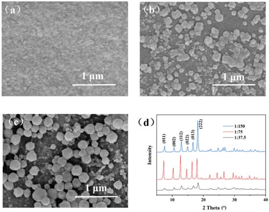 SEM images of ZIF-8 particles on PAN support with different molar ratios of zinc ions to 2-methylimidazole (constant voltage: 1 V, deposition time: 10 min): (a) 1:37.5, (b) 1:75, (c) 1:150; (d) XRD patterns of ZIF-8 particles.