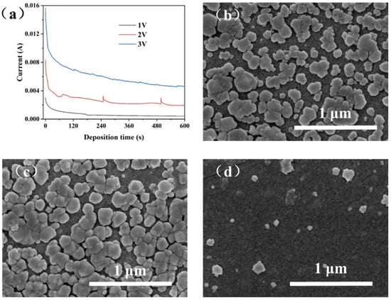 (a) The current–time curve under different constant voltages; SEM images of ZIF-8 particles on support: (b) 1 V, (c) 2 V, (d) 3 V (molar ratio of zinc ion to 2-methylimidazole: 1:75, deposition time: 10 min).