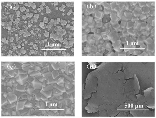 SEM images of ZIF-8/PAN membranes prepared with different deposition times: (a) 10 min; (b) 40 min; (c,d) 60 min (constant voltage: 1 V, molar ratio of zinc ion to 2-methylimidazole: 1:75).