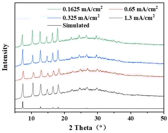 XRD patterns of ZIF-8/AAO membranes deposited for 60 min under different deposition currents.