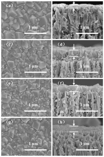 SEM images of ZIF-8/AAO membranes deposited for 60 min under different deposition currents, in which the left images show the surface morphology and the right images show the cross-section morphology: (a,b) 0.1625 mA/cm2, (c,d) 0.325 mA/cm2, (e,f) 0.65 mA/cm2, (g,h) 1.3 mA/cm2.