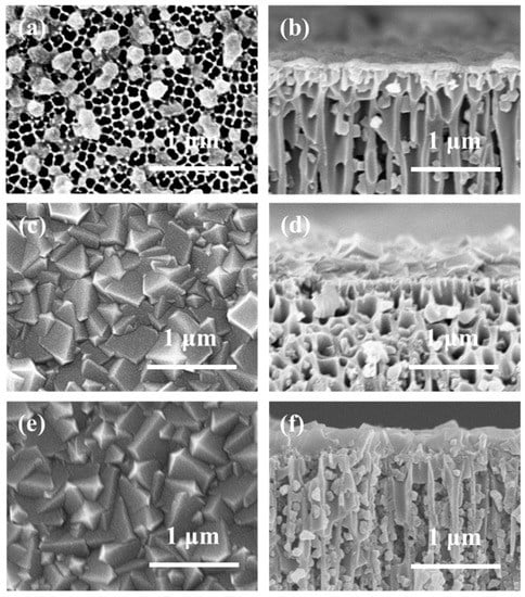 SEM images of ZIF-8/AAO membranes with different deposition times, in which the left images show the surface morphology and the right images show the cross-section morphology: (a,b) 20 min, (c,d) 40 min, (e,f) 60 min (deposition current: 0.65 mA/cm2).
