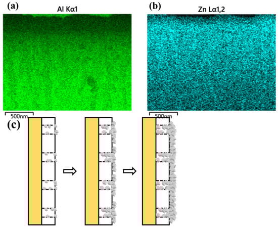 (a,b) Mapping characterization results of ZIF-8/AAO membrane prepared with deposition time of 60 min and current of 0.65 mA/cm2. (c) Schematic diagram of the evolution of the ZIF-8 membrane structure during formation.