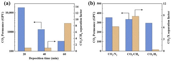 The CO2/CH4 mixture separation performance of the ZIF-8 membranes as a function of EPD time (with the current of 0.65 mA/cm2) is presented in Figure 12a. With increasing the deposition time, the CO2 permeance decreases from 18697 to 334 GPU. When the deposition time increases from 20 to 40 min, the CO2 permeance decreases drastically from 18697 to 1358 GPU while the separation factor is still about 1, indicating that the coverage of ZIF-8 particles on the AAO support increases significantly, which is in agreement with the SEM results (Figure 10). However, there are still many non-selective defects in the membrane. When the deposition time further increases to 60 min, the decrease in CO2 permeance becomes slow, reducing from 1358 to 334 GPU, but the separation factor rapidly increases from 1 to 8.8. With increasing the deposition time from 40 to 60 min, the surface morphology of the ZIF-8 membranes nearly changes. Both of the ZIF-8 membranes are highly intergrown without pinholes. The decrease in gas permeance and increase in gas selectivity indicate the healing of micro-defects in the ZIF-8 membranes during the growth stage from 40 to 60 min.
