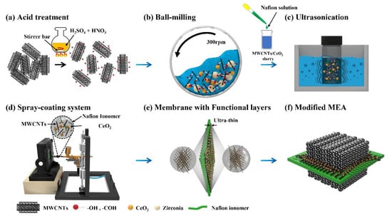 Schematic diagrams of preparing the MEA with the ultrathin MWCNTs/CeO2 functional layers. (a) Acid treatment process of the MWCNTs. Dispersion processes of MWCNTs/CeO2 through (b) successive mechanical ball-milling process and (c) ultrasonication. (d) Spray-coating process. (e) Mechanically and chemically reinforced Nafion membrane with the ultrathin MWCNTs/CeO2 layers at both sides. (f) Completed MEAs with the modified membrane.