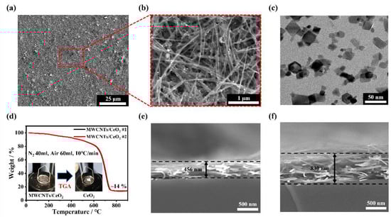SEM surface images of the MWCNTs/CeO2 without the Nafion ionomer with magnification at (a) 1 k and (b) 30 k. (c) TEM image of the CeO2 nanoparticles. (d) TGA results of the MWCNTs/CeO2. Cross-sectional SEM images of the MWCNTs/CeO2 with thicknesses of (e) 450 nm and (f) 830 nm.