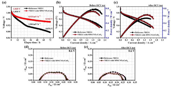 To evaluate the performance and durability of the MEAs with the prepared membranes, single cells were constructed with only differences in the membranes, and the electrochemical characteristics were measured. Figure 4a depicts the OCV decay spectra over 72 h under accelerated conditions to compare the membrane’s chemical degradation rates due to the free radicals generated during the OCV holding test [59,60]. The OCV holding protocol was used to investigate the difference in chemical durability between the reference NR211 and the modified NR211 with the MWCNTs/CeO2 functional layers. The OCV holding test was conducted at a high temperature of 90 °C and a low RH of 30% by supplying 300 sccm of H2 and O2 to the anode and cathode, respectively. The MEA with the modified membrane with the MWCNTs/CeO2 functional layers exhibited a much lower decay rate of 0.931 mV·h−1 than the MEA with a pristine NR211 membrane (1.861 mV·h−1). This indicates that the very low loading of CeO2 in the ultrathin functional layers can exhibit the role of an effective radical scavenger at both sides of the membrane (membrane/electrode interface). In addition, both samples started at 1.010 V in a well-polarized state, which confirmed that the incorporation of the MWCNTs/CeO2 functional layers did not damage or change the bulk characteristics of the Nafion membrane and was an effective strategy for engineering the interface between the membrane and electrode of the MEA. Figure 4b,c show the polarization curves before and after the OCV holding test at 70 °C and 100% RH with a H2/air flow rate of 150/800 mL·min−1 and no backpressure, respectively. In the case of the initial MEA performances, the MEA with the modified membrane shows 7.28% inferior peak power density (PPD) compared to the MEA with the reference NR211 because the addition of the functional layers inevitably increased the ohmic resistance and charge transport resistance at the interface, as shown in Figure 4d and Table 3. However, the increases in ohmic resistance (3.93%) and charge transport resistance (2.22%) were sufficiently restricted because of the ultrathin layer thickness (450 nm), the well-dispersed CeO2 on the 3D MWCNTs fiber network, and filling the ionomer in the void space. Notably, following 72 h of the OCV holding test, the MEA with the modified membrane exhibited higher PPD and current density at 0.6 V by 17.9% and 36.9%, respectively, compared to those of the MEA with the reference NR211 due to the improved chemical durability from the MWCNTs/CeO2 functional layers. The corresponding EIS spectra confirmed that the increased rates in ohmic resistance and charge transport resistance for the MEA with the modified membrane were not large compared to those of the reference after the durability test (Figure 4e and Table 3). In particular, when compared to the MEA with the modified membrane, the significant increase in charge transport resistance of the reference MEA during the OCV holding test further confirmed that the radical-attack-induced chemical degradation of the membrane severely deteriorated the charge transport at the membrane/electrode interface.