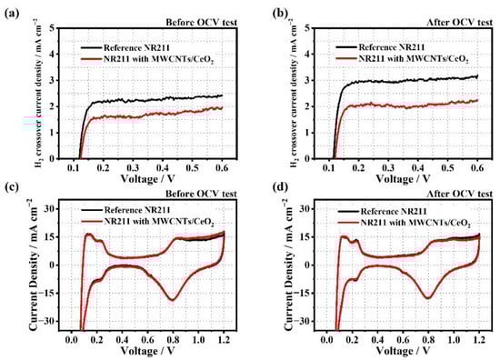 Figure 5a,b show the LSV spectra before and after the OCV holding test to compare the hydrogen crossover current densities of the MEAs, respectively. In the case of the initial hydrogen crossover current density, the MEA with the MWCNTs/CeO2 functional layers had a 22% lower value (1.75 mA·cm−2) compared to the reference MEA (2.25 mA·cm−2). This signifies that the addition of the MWCNTs/CeO2 functional layers on both sides of the membrane acted as an effective gas barrier (Figure 5a). Notably, after the OCV holding test, the difference in hydrogen crossover current density further increased to 33% because of the improved chemical durability of the modified membrane. Figure 5c,d show the CV spectra before and after the OCV holding test, respectively; almost the same ECSA values were calculated for the MEAs with the reference and modified membranes because the same catalyst and catalyst loading amounts were used in the experiments. Moreover, the differences in ECSA before and after the OCV holding test were insignificant, which means that the electrode suffered little damage compared to the highly damaged membrane during the durability test. The summarized values are shown in Table 4.