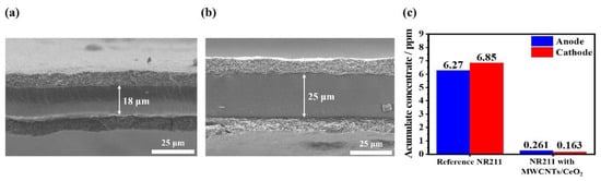 Cross-sectional SEM images of the MEAs with (a) the reference NR211 and (b) the modified membrane with the MWCNTs/CeO2 functional layers after the OCV holding test. (c) Accumulated concentration of fluoride ions in the drain water after the OCV holding test.