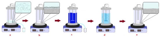 The replaceability of the coating was investigated using 6.5 g/m2. The coating was placed, removed and built up to five times, and the performance in terms of dye removal and permeability was examined each time the CNFs were replaced. In Figure 1, a scheme of the complete process is shown. First, the CNFs solution was placed in the system and was filtrated (a). When all the solution has passed through the membrane, a visible to the naked eye thin film is observed (b), then, the dye is filtrated (c). After MB filtration, the coating layer was easily removed by increasing the stirring from 150 rpm to 750 rpm (d), and finally, the membrane is ready for a new coating (e). The MB retention of a pristine UF membrane was also measured 5 times with solutions of the same concentration.