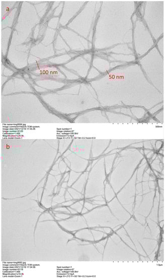 CNFs were prepared from biomass pretreated with DES (choline chloride: lactic acid). It has been reported that this eutectic mixture enables cellulose fibril to untangle from fibers by weakening the cellulose structure, nevertheless, it is not sufficient for defibrillation in the nanoscale []. Thus, there is a need for other treatment steps to achieve the CNFs. Figure 2 shows the TEM images of the CNFs prepared in this study. As can be seen, on average, diameters of the fibers are approximately 100 nm, and their length is in the microscale, in line with the definition of CNFs [,]. Fibril diameters from 50 to 100 nm were observed. This result is consistent with the results presented by Liu et al. [] (20 to 80 nm), who prepared CNFs with a similar DES pretreatment as used here, but with different further steps. Liu et al. [] did the mechanical disintegration with a microfluidizer, while here, ultrasonication was applied. Recently, ultrasonication, which is considered as a green process [], has been used for cellulose nanofibrillation. During ultrasonication in a liquid medium, the formation and rapid collapse of microbubbles degrade polysaccharide linkages that promote nanofibrillation of the cellulose [,]. Conventional techniques such as high-pressure homogenization and microfluidization require multiple passes and moreover, often suffer from clogging when the fibers are not reduced by a pretreatment (previously defibrillation) [,,]. In this sense, ultrasonication could emerge as an alternative to microfluidization when preparing CNFs. TEM images confirmed that CNFs can be obtained by the novel method proposed, which consisted of a two-step process: a non-derivatizing DES treatment and a simple mechanical treatment (high-speed homogenization and sonification).