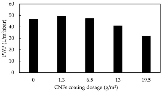 The relation between PWP of the UF membrane and the used coating dosage measured in this study is shown in Figure 4. Initially, native UF membranes presented, on average, a PWP of 46.9 L/m2hbar. With the two smallest coating doses used, the PWP was not significantly affected. A minor PWP decrease occurred when a dosage of 13 g/m2 was used for coating while the use of a dosage of 19.5 g/m2 resulted in a clear decrease in PWP; the PWP displayed was approximately 70% of the one shown by the pristine membrane. The result is reasonable, because the more CNFs there are on the membrane surface, the thicker and denser layer they can form when they are pressed towards the membrane surface during the filtration. The same phenomenon has been reported also by Wang et al. []. They coated filter paper with CNF at 60 °C using vacuum drying, and they found that the flux of a filter paper coated with a solution of 0.05% decreased by approximately 18% of its original performance; furthermore, greater flux reductions of nearly 83% and 96% were observed when 0.1% and 0.2% CNF solutions were used, respectively [].