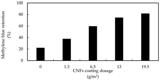 A positive correlation was found between the amount of CNFs coating and the MB retention. The more the coating dose was increased, the more MB was retained, as can be seen in Figure 5. The pristine membrane displayed a 22% MB retention. However, when the dosage of 1.3 g/m2 was used for the coating, the MB retention increased up to 1.7 times. The highest MB retention, 82%, was shown for the membrane coated with the highest CNF dosage (19.5 g/m2). The increased retention could be attributed to the adsorption of the dye onto the fibers. The higher the amount of CNFs used in the coating, the higher was the surface area of the CNFs and the better was the removal of MB. At pH 6.7, the adsorption was promoted by electrostatic attraction of cationic dye and negatively charged CNFs.