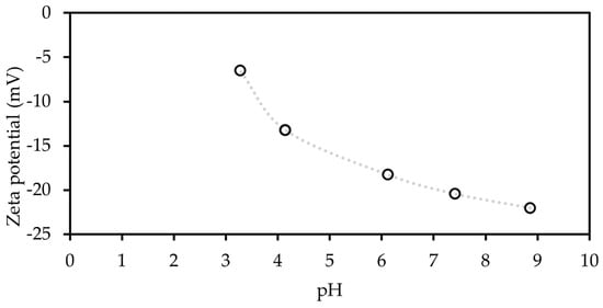 The pH is known to be an important parameter during MB adsorption; Fradj et al. [] reported that at acidic pH, the removal by UF membranes ranged from 13 to 18% depending on the concentration of MB. Moreover, Chan et al. [] reported that the removal of MB by adsorption on CNFs increased from approximately 35% to approximately 78% when pH was increased from 3 to 7. The surface charge of the CNFs (Figure 6) expressed by the zeta potential at pH 7 was approximately −20 mV, consistent with other study presented by Kim et al. []. The MB is mainly found in its cationic form because of its acid-base equilibrium and low, less than 1, pKa. As a result, at pH 6.7 (condition used in this study), the dye removal was promoted by electrostatic attraction of the unprotonated dye and the negatively charged CNFs []. The pristine RC70PP membrane is also negatively charged (zeta potential −27 mV at pH 7) based on the streaming potential measurements reported by Nieminen et al. []. This explains the 20% initial dye retention of pristine membrane. However, once the adsorbent sites were full by the MB, the retention was less than 2% (Section 3.2.3).