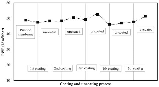 The coating of the membrane with 6.5 g/m2 of CNFs did not change the PWP of the membrane. In addition, no change in the PWP flux was observed when the coating layer was removed and prepared again. As Figure 8 shows, it is possible to remove the coating layer and reconstruct it again several times. The results prove that CNFs coating can be replaced several times without compromising its performance in terms of water flux or retention.