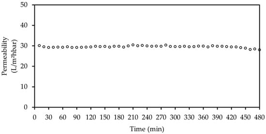 A CNFs content of 6.5 g/m2 was used to test the stability of the coating for 8 h as shown in Figure 9. It is noteworthy that a brand new RC70PP membrane was used for this experiment, thus, the permeability of the pristine membrane was approximately 36 L/m2hbar, which was lower by the other results presented throughout this study. The permeability remained intact during the whole filtration process, indicating that the CNFs remained stable on the surface of regenerated cellulose membranes for long periods of time. Moreover, the coating layer was visible by the naked eye, which confirmed that the CNFs can last at least 8 h at a filtration condition of 22 °C and 150 rpm of stirring.