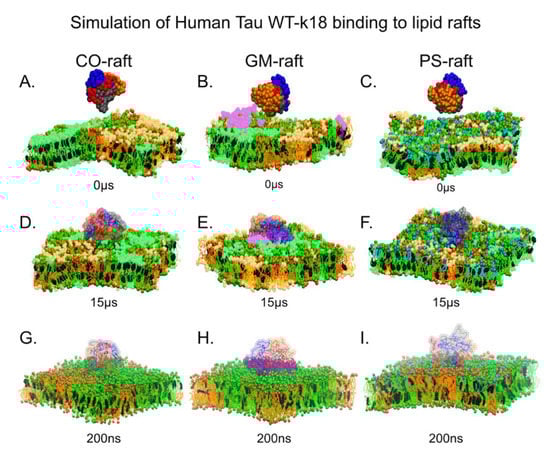 In this pilot study, we have designed and created a 130-residue long tau fragment, or K18 monomer, which represents the microtubule binding domain of tau [12], and have simulated K18 aggregates (dimer and tetramer) via self-aggregation of the K18 monomers in solution. The K18 oligomers containing 4 repeated domains (R1, R2, R3, and R4) together with the N-terminus are known to bind to membrane lipids, particularly the PS, and participate in beta-sheet formation upon binding [6,12]. Here, we demonstrate that K18 oligomers bind specifically to the Lod boundary domains in the CO-raft, the GM-clusters in the GM-raft, and the PS-clusters in the PS-raft mostly within 10 μs of CG simulations.