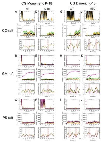 A minimum distance (mindist) analysis (see Materials and Methods) based on a 3-panel mindist plot format was performed to investigate the binding kinetics and residue-specific binding domain of K18 oligomers on all three rafts. Figure 3 shows the mindist plots for the representative replicates of CG monomers and dimers of WT-K18 and MBD-K18 on all lipid rafts, and Figure SD1 in Supplementary Materials shows the plots for the representative replicates of CG tetramers and AA tetramers of WT-K18 and WT-K18 for all lipid rafts.