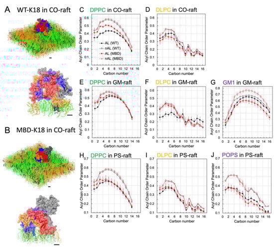 For the CO-raft, the acyl chain orders of DPPC in the AL lipids surrounding the AA WT-K18 tetramer were significantly lower than those surrounding the MBD-K18 tetramer for carbon numbers 1–10 (Figure 5C). Yet, no significant difference in the order parameters of the AL lipids for WT-K18 vs. MBD-K18 was observed for DLPC across all carbon numbers (Figure 5D). As controls, the acyl chain orders of either DPPC or DLPC in the non-AL lipids, nAL, or lipids outside the AL lipid shells, for the AA WT-K18 were identical to that for the AA MBD-K18. The results suggest that the AA WT-K18 perturbed the DPPC and the DLPC chains’ order more than those of the AA MBD-K18 at the top half of the acyl chain region for the CO-raft system. The results indicate that WT-K18, compared to MBD-K18, significantly perturbed the saturated lipids, DPPC, upon binding to the CO-raft.