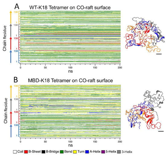 Membrane-templated protein folding of K18 tetramer on CO-raft surfaces. The secondary structures of atomistic WT-K18 (A) and MBD-K18 (B) represented by DSSP plots in which the secondary structure of each residue was calculated as a function of time of simulation (0 to 200 ns). The structures were also visualized using the VMD program. Each chain is color coded, chain A in blue, chain B in red, chain C in gray, and chain D in orange. The color codes for the secondary structures are also given. The scale bar indicates 10 angstroms.