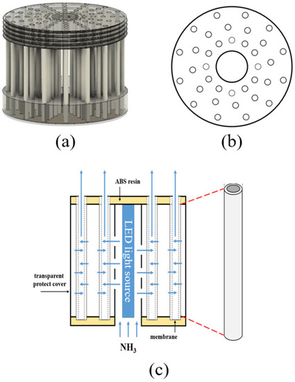 Before testing the NH3 decomposition performance, the prepared photocatalytic membranes were assembled into a module. Figure 1a shows the basic concepts of the photocatalytic filter-type module. The shape of the filter-type module was a cylinder (20 cm × 10 cm). Thirty-six photocatalytic membranes were inserted into the corresponding holes of an acrylonitrile butadiene styrene (ABS) resin structure in the form of a disk (see Figure 1b). It was decided to use a 36-membrane configuration because it offered a reasonable balance between robustness, cost, and performance [11]. Each membrane was fixed and sealed using epoxy resin as adhesive and the side part of the filter-type module was covered using transparent protection. The effective single membrane area was calculated to be approximately 0.01 m2. At the axis of the cylindrical filter-type module, a hole was made to leave space to install a triangular LED light source to irradiate the photocatalytic membranes from inside the filter-type module (see Figure 1c). The NH3 mixed with air (99.999%) was supplied and calibrated using mass flow controllers. The NH3 concentration was analyzed using gas chromatography (GC).