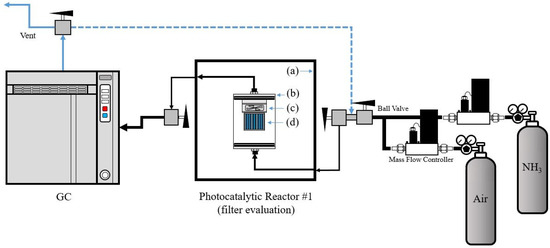 To evaluate the performance of a photocatalytic filter-type module, the portable device was placed in a hermetically sealed test chamber that was completely isolated from the outside. The modular device was equipped with a DC fan and a DC power supply. The test chamber was, in turn, closed in a dark room to avoid any external interference. Figure 2 shows the schematic image of the photocatalytic filter-type module. Initially, the NH3 was supplied continuously through reactor #1 as a common flow-type or flow-through reactor until stabilization of the entire system was achieved. When the concentration of NH3 stabilized, the LED light source was turned on. At the same time, the system was switched from the initial flow-type reactor to a batch-type reactor operating in an unsteady state for 30 min.