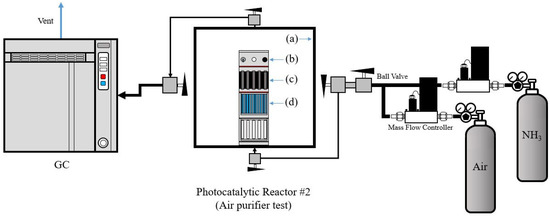 The photocatalytic filter-type module was reassembled into an acrylic structure to produce a portable air purifier device with a more compact size. The air-purifying efficiency in the contained environment was tested at room temperature with an NH3 concentration of 50 ppm. Figure 3 shows a schematic image the reactor #2 used for the evaluation of photocatalytic air purifier performance.
