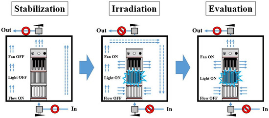 There were three steps to testing reactor #2. Figure 4 shows the three steps for the evaluation of photocatalytic air purifier performance. The three steps were stabilization, irradiation, and evaluation. The stabilization process was the same as the previous experimental system (see reactor #1). Once the NH3 concentration was stabilized, the valves at the top and bottom of the (acrylic) square-type dark-box chamber were switched to capture and then trap the NH3 in the test chamber and the irradiation was turned on. This step was the simulation of a possible situation in an indoor environment without air circulation under a blue LED light source. The test chamber was once again opened in the final evaluation step to examine the residual NH3 and to check whether the concentration of NH3 was under the limits of the lachrymatory threshold (50 ppm) in humans [1].