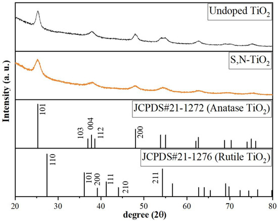 where D, K, λ, βr, and θ are the average crystallite size, shape factor, X-ray wavelength, full width at half maximum of the diffracted peak (FWHM), and Bragg’s angle, respectively. The crystallite sizes of the undoped TiO2 and S,N-doped TiO2 photocatalyst powders were estimated to be 6.90 nm and 6.77 nm, respectively. In accordance with previously reported data [30,31,32], the doping approaches resulted in a decrease in the average crystallite size of photocatalyst powders.