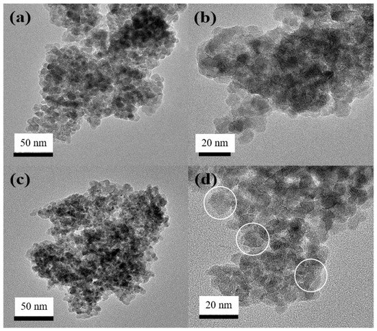 The microstructures of the undoped TiO2 and S,N-doped TiO2 photocatalyst powders were examined using TEM analysis at Figure 6. Previous research [19,20] found that the undoped TiO2 was organized into monodispersed spherical TiO2 particles with an average diameter of approximately 10–12 nm, as is also shown in Figure 6a,b. Figure 6c,d shows that spherical and irregular-shaped TiO2 particles were mixed in the S,N-TiO2 photocatalyst powder. Irregular-shaped TiO2 particles are shown in Figure 6d.