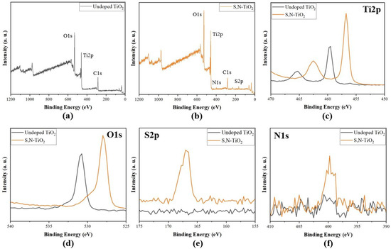 XPS survey spectra of (a) undoped TiO2 and (b) S,N-doped TiO2. High-resolution XPS spectra of the (c) Ti2p, (d) O1s, (e) S2p, and (f) N1s regions.