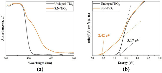 Figure 8a shows the absorbance properties of undoped TiO2 and S,N-doped TiO2 photocatalyst powders between 200 nm and 800 nm. The presence of the sulfur and nitrogen ions in the TiO2 lattice extended the absorbance from the UV region, with the absorption edge at about 400 nm, to the visible light region (400~600 nm). These results are in good agreement with data obtained by other authors [20,39,40,41].