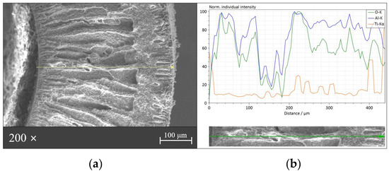 We used an EDS line-scanning measurement on the S,N-doped TiO2/Al2O3 HF membrane to further investigate the sample’s structure. The S,N-doped TiO2/Al2O3 HF membrane’s EDS analysis result is shown in Figure 9b, where the scanning spectra of Ti, O, and Al elements are presented in different colors. The Ti signals emerged simultaneously on both the S,N-doped TiO2/Al2O3 HF membrane sides, while the Al signals first appeared in the middle of the membrane. In addition, we estimated the thickness of the photocatalytic layer to be between 8 and 10 nm based on the intensity of the Ti signal. Although the S and N signals were difficult to obtain due to the low concentration of these elements on the photocatalytic layer, the deposition of S,N-doped TiO2 was clearly indicated.