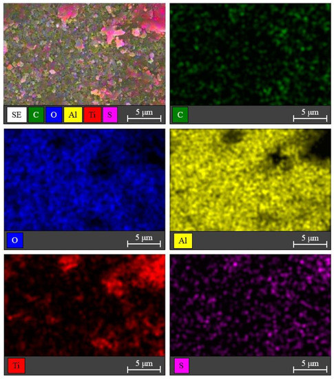The elemental distributions of the corresponding C, O, Al, Ti, and S elements on the surface of the S,N-doped TiO2/Al2O3 HF membrane were examined using the EDS mapping analysis. As shown in Figure 10, Ti and S elements were found, whereas the element N was missed due to its low content. The elemental distributions of S and N were 3.2 and 1.6 weight percent, respectively (see Supplementary Materials, Table S2).