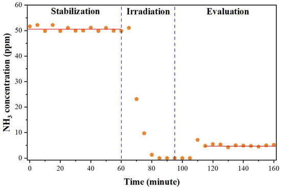 In the first step, where NH3 was continually delivered through reactor #2, the test chamber had to be stabilized for an hour. The solid line in Figure 12 represents the linear extrapolation of the data collected during the stabilization of the system and it serves as a visual representation of this step. During the second step of the process, called “irradiation”, the in and out valves were closed and, simultaneously, the blue LED light source was switched to simulate indoor gas pollution of gaseous NH3 without air circulation. It was noted that the NH3 concentration seemed to gradually decrease due to the residual gas in the line. When the test chamber was finally opened during the evaluation step, the NH3 concentration appeared to be very low in contrast to the initial concentration (50 ppm). The amount of remaining NH3 inside the test chamber was approximately 5 ppm. The detected NH3 concentrations in the test chamber were below the tolerated limits specified in the literature [1,2]. This result is significant because it supports the benefits of the proposed approach for the gaseous NH3 photocatalytic degradation reaction in terms of protecting the environment and public health.