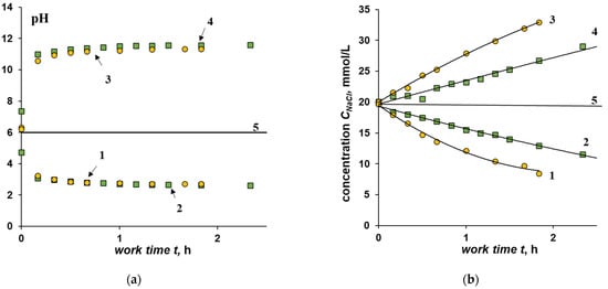 4.1. The Results of Adjusting the pH of the NaCl Solution with Simultaneous Desalting in Circulation Mode