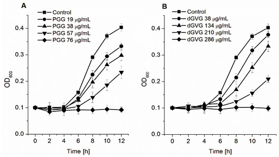 Growth curves of S. aureus 8325-4 in the presence of PGG (A) and dGVG (B). The data presented are the means ± SD, n = 6.