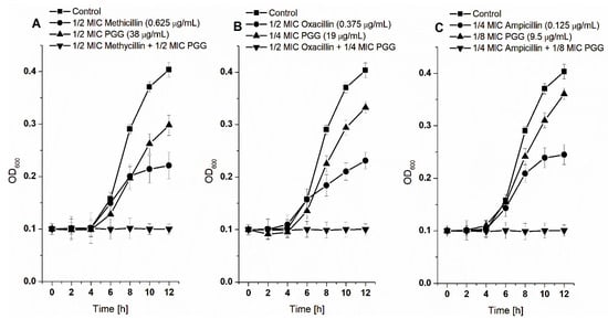 Growth curves of S. aureus 8325-4. Bacteria were grown at sub-inhibitory concentrations of PGG alone, antibiotic alone (methicillin (A), oxacillin (B), ampicillin (C)), and in combination. The data presented are the means ± SD, n = 6.