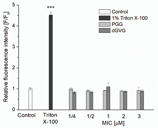 Influence of PGG and dGVG on S. aureus cell membrane integrity. Briefly, 1% Triton X-100 was used as a positive control. Bacterial cells labeled with Sytox Green in the presence of PGG and dGVG in the concentration range of ¼ x MIC to 3 x MIC, which corresponds to 20 μM, 40 μM, 80 μM, 160 μM, and 240 μM for PGG and 75 μM, 150 μM, 300 μM, 600 μM, and 900 μM for dGVG. The data presented are the means ± SD, n = 6. Statistical significance was estimated using a one-way ANOVA test (results compared to control, *** p < 0.001).