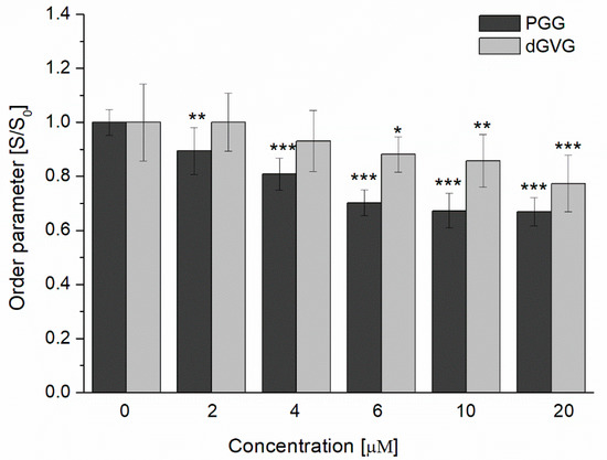 Changes in the order parameter S/S0 of the S. aureus membrane measured using a TMA-DPH probe in the presence of PGG and dGVG. The data presented are the means ± SD, n = 6. Statistical significance was estimated using a one-way ANOVA test (results compared to control, * p < 0.05; ** p < 0.01; *** p < 0.001).